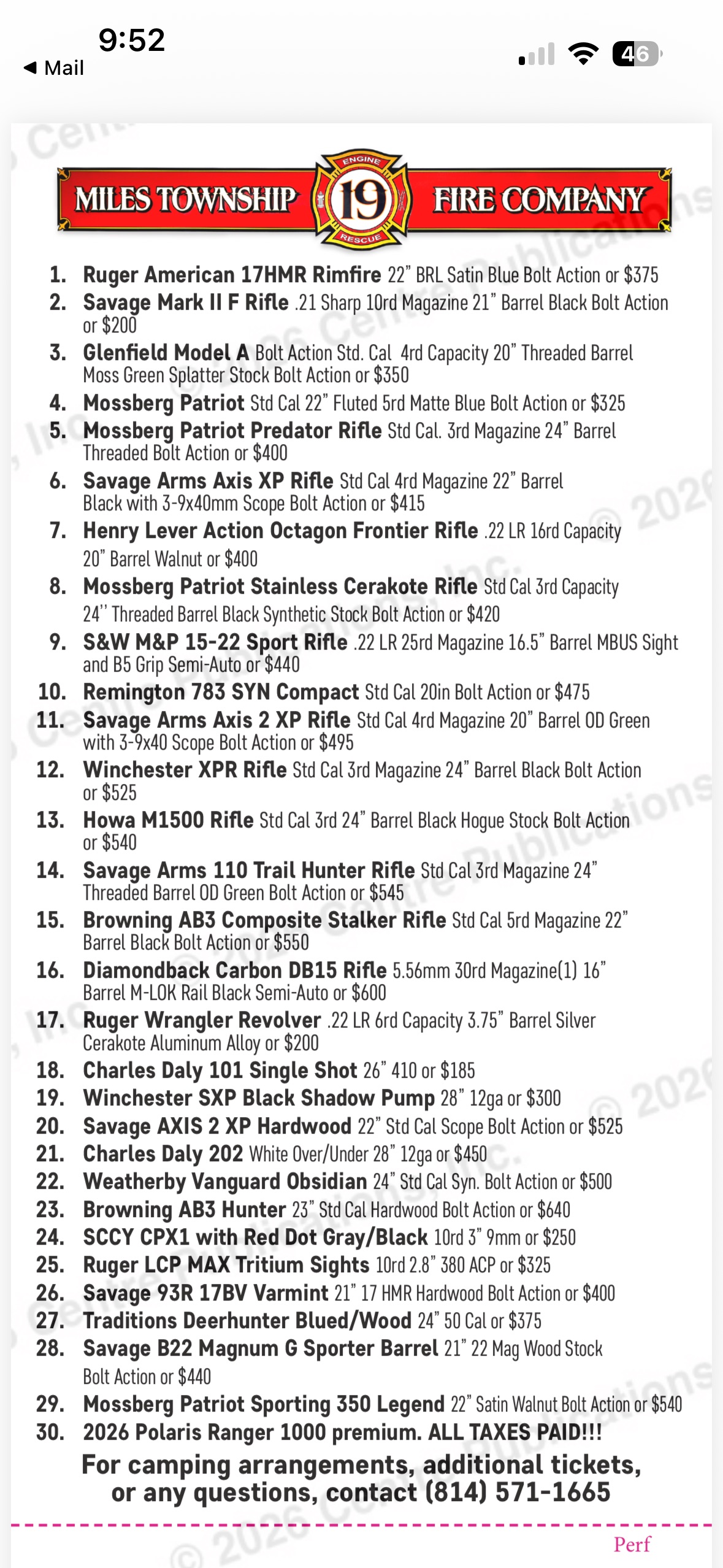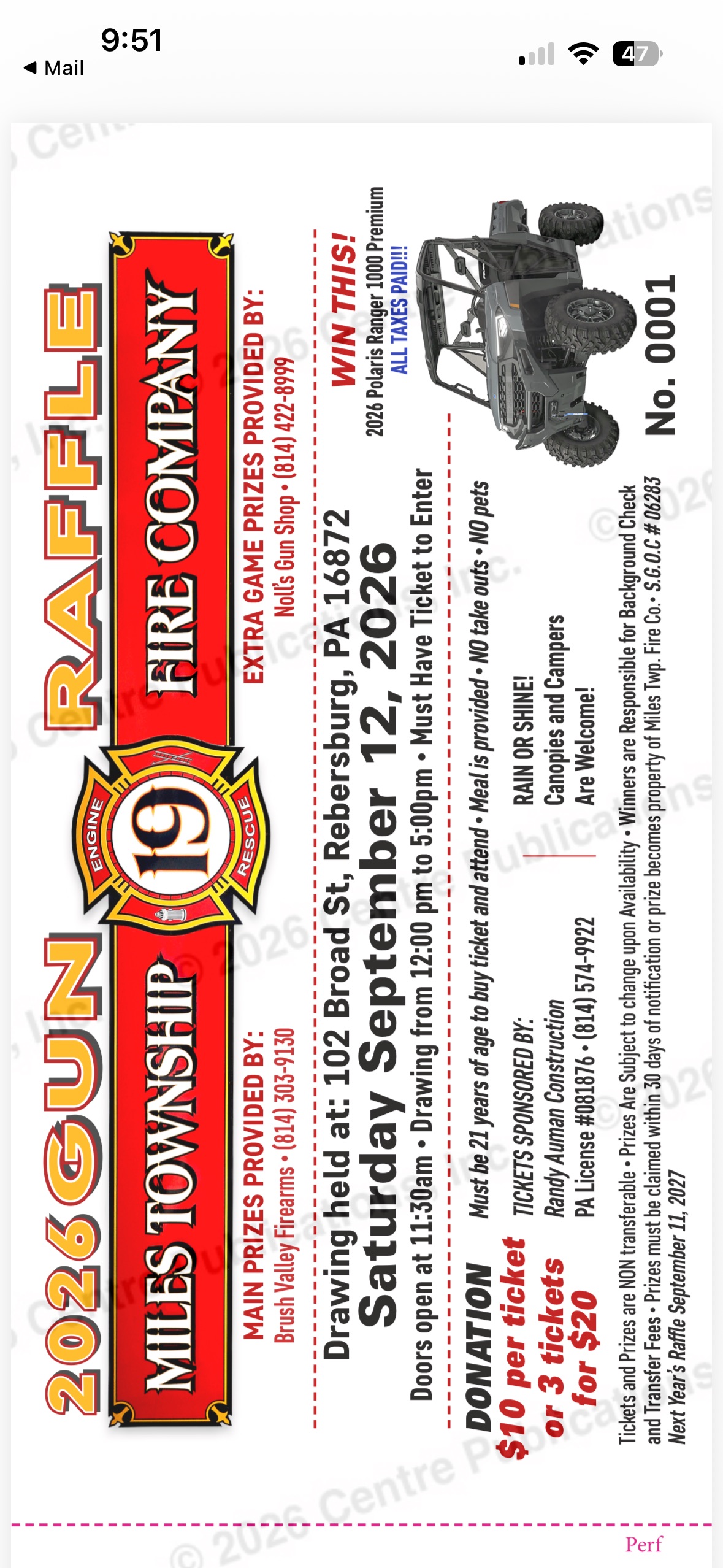 If you are interested in tickets or interested in selling tickets Please Contact 814-571-1665 For every 12 Tickets you sell you get 1 chance at a sellers prize. HOPE TO SEE YOU THERE!!!
