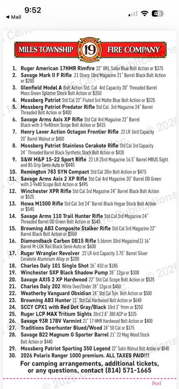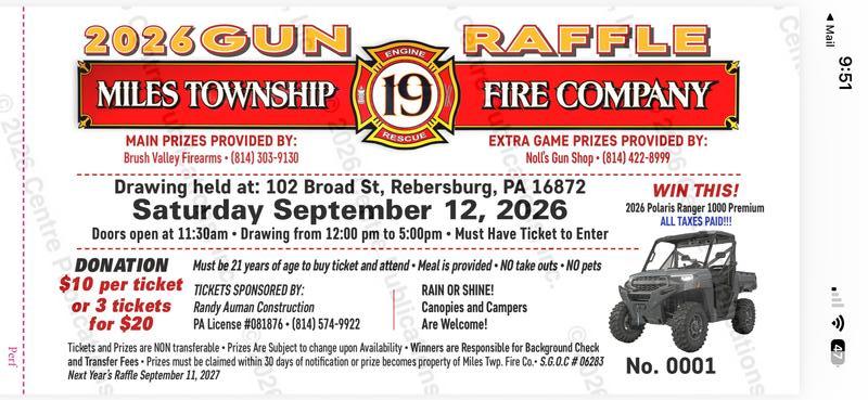 | Gun Raffle are printed.. Tickets are $20 for three entries, each providing a chance to win one of 30 prizes, including a 2026 Polaris Ranger 1000 Premium with all taxes paid. Each ticket admits one person to the event and includes access to an all-you-can-eat meal on the day of the raffle.